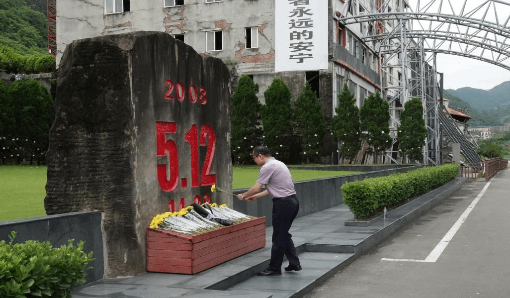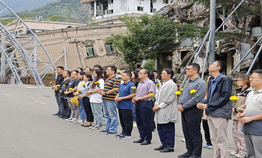 党委书记廖军的带领下,全体师生党员三鞠躬并向在汶川地震中遇难的同胞献花,以表达对逝者的哀思。
