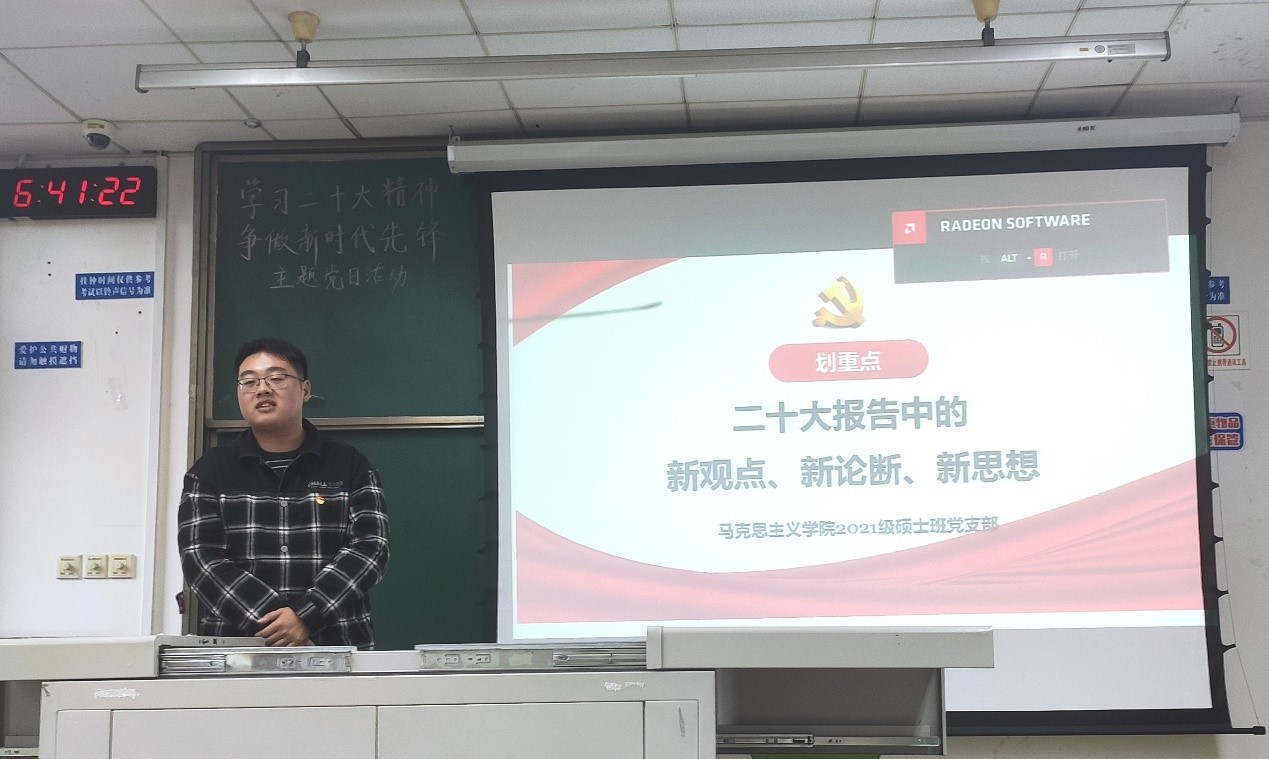 为深入学习贯彻党的二十大精神,全面深刻认识党的二十大的重要意义,明确把握二十大的精神实质,10月27日下午3时,“学习二十大精神、争做新时代先锋”主题党日活动在九里校区J4322开展,会议由黄蓉同志主持,2021级、2022级硕士班全体学生党员参加。