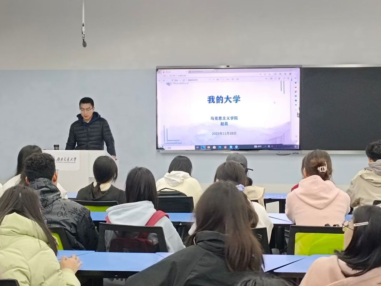 于X9302举行了新生生涯教育规划讲座,本次讲座由院团委书记赵晨老师主讲,全体新生参与。