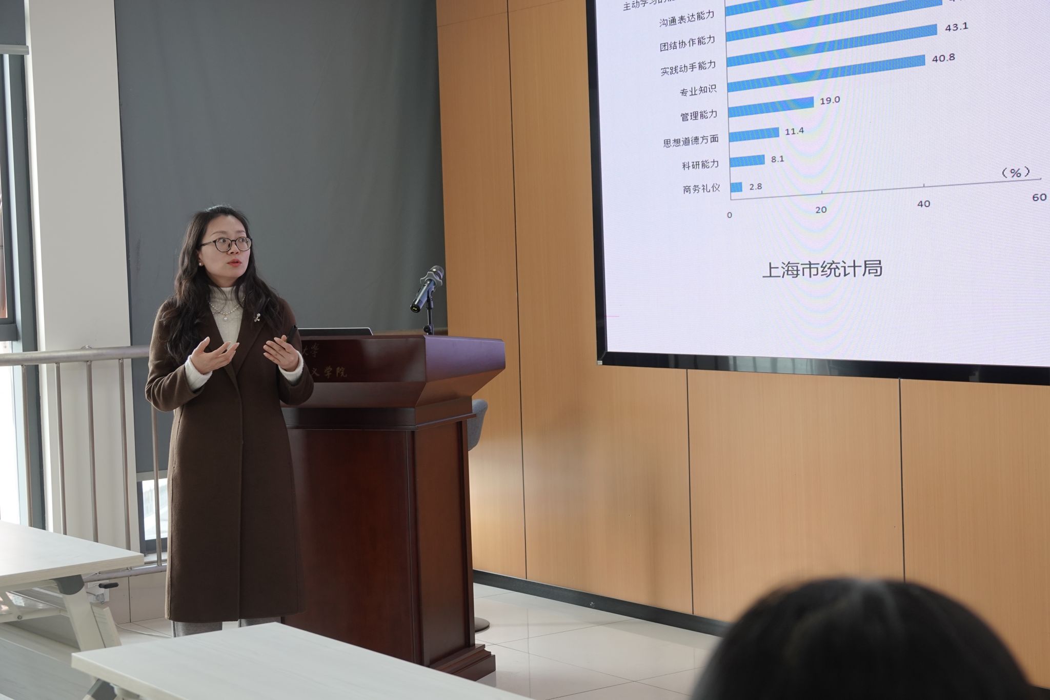 讲座伊始,陈曦轶以2025届毕业生就业意向调查数据为切入点,通过可视化图表直观呈现同学们面临的就业困境,深度剖析就业焦虑的生成机制,引发同学共鸣。其次,陈曦轶对于就业问题开展了多维指导,引导同学们从自我认知出发,明确职业目标,首先明晰“我喜欢做什么,我能做什么,我愿意做什么”三个问题,再根据当前社会形势以及自己的实际需求,寻找适合自己的职业。