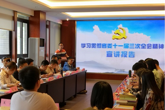 曲博士向在座师生介绍了中国共产党四川省第十一届委员会第三次全体会议的基本概况,并从认识省委十一届三次全会的重大意义、坚定习近平新时代中国特色社会主义思想和习近平总书记对四川工作系列重要指示精神作为根本方针、以新时代担当作为推动省委决策部署落地落实等方面进行了宣讲。