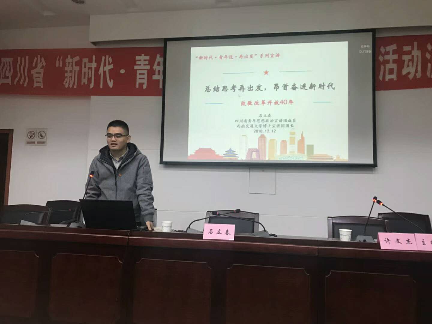 12月12日9:00-11:30,四川省青年思想政治宣讲团泸州行第一站来到了纳溪区,四川省青年思想政治宣讲团成员、西南交通大学博士宣讲团团长石立春老师进行题为《总结思考再出发,昂首奋进新时代》的宣讲。此次宣讲在纳溪区委大礼堂,吸引了来自泸州国家高新区纳溪科技园和泸州纳溪经济开发区的众多企业青年,还有镇街道团委书记、副书记,农村青年代表等。宣讲活动由泸州市纳溪区团委副书记许文杰主持。
