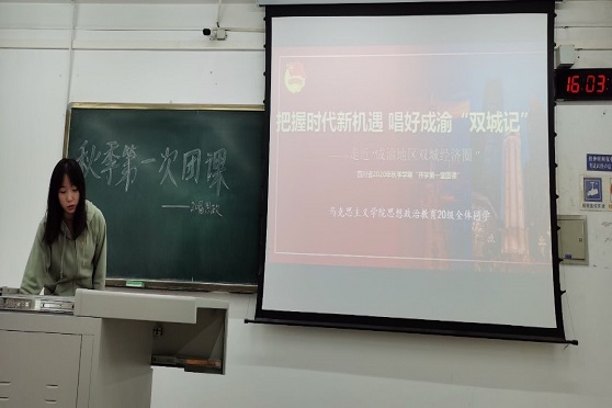 思想政治与教育专业的全体同学召开了以“把握时代新机遇,唱好成渝‘双城记’——走近‘成渝地区双城经济圈’”为主题的团课,本次团课由思政2020-01支部团支书徐景行和思政2020-02支部李聪昊主持。
