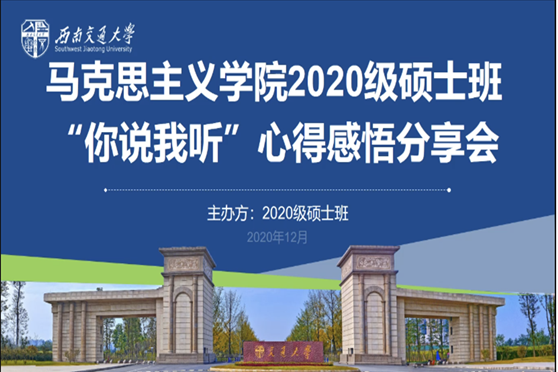 12月14日19:30,2020级硕士班“你说我听”心得感悟分享会在腾讯会议以线上的形式顺利开展。2020级硕士生五位同学白郭军、唐倩、吴江南、彭子轩、阳彩凤为大家分享他们本学期的学习经验、生活实践和感悟思想。本次分享会由2020级硕士研究生班班长魏敏主持。