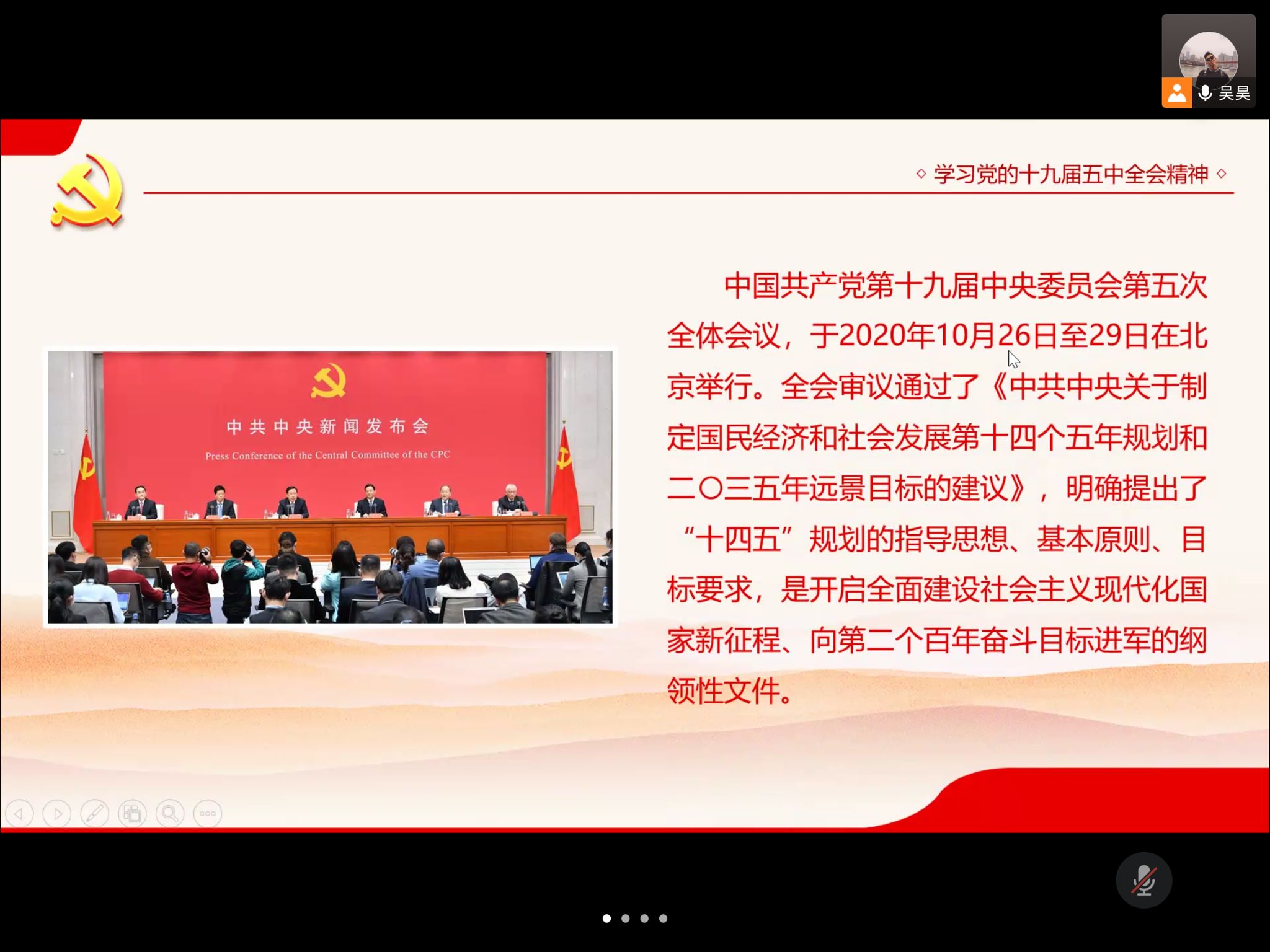 吴昊同学分别从规划《建议》起草、亮点、突出议题,双循环的新发展格局,如何实现2035远景目标五个方面深刻地介绍此次党的十九届五中全会精神,详细阐述了起草遵循的五项原则,核心要义的体现,其重要地位并介绍了部分主要议题。吴昊同学着重强调了三个值得关注的“首次”。让同学们感受到规划《建议》真正体现我们党为中国人民谋幸福为中华民族谋复兴为中华民族谋复兴的初心使命。