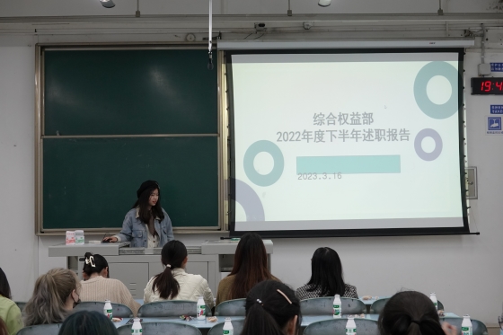 首先,学生会组织部、宣传外联部、活动事务部、综合权益部和文体部轮流上台汇报工作,学生会各部门负责人有序地针对上学期工作进行了简明扼要的述职汇报,总结与反思了上学期的工作情况,并介绍了本学期的工作计划与展望。