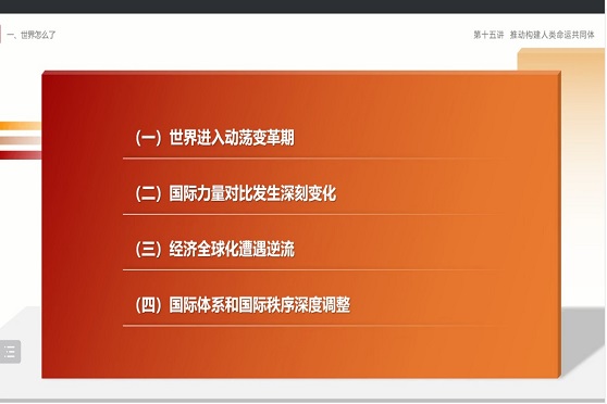 的研究生,同学们要用正确的历史观、大局观、角色观去把握世界历史大势。紧接着,杨老师从“世界怎么了,人类向何处去”的角度展开了讲述。在第一讲主要涵盖了四个方面的内容,一是指出世界正经历百年未有之大变局,世界进入动荡变革期;二是国际力量对比发生深刻变化,新兴市场国家和发展中国家群体性崛起势不可挡,将使全球发展的版图更加全面均衡,使世界和平的基础更为稳固;三是指出了当前经济全球化遭遇逆流,我们要把握经济全球化发展大势,反对单边主义、保护主义,推动人类走向更加美好的未来;四是国际体系和国际秩序深度调整。