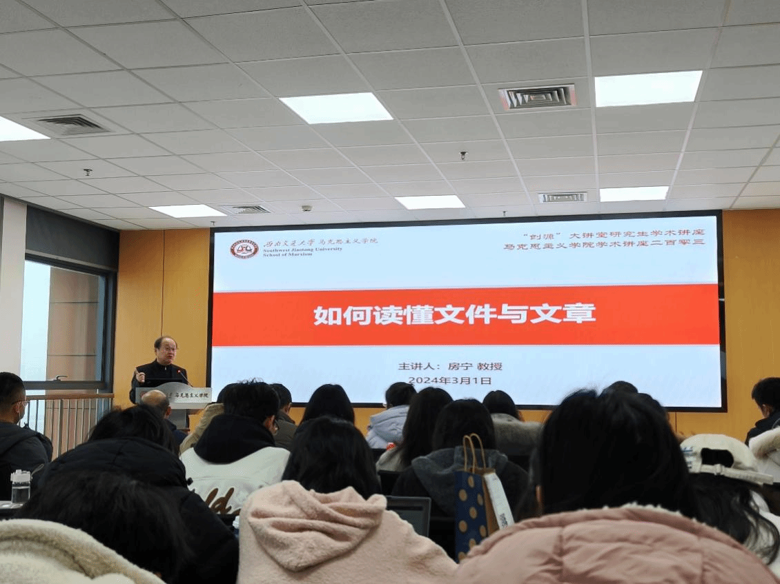 房宁教授以“如何读懂文件与文章”为题,结合自己常年做政治学研究和用“脚底板做学问”的实际,站在马克思主义理论学科的视角,从政治语义学及其重要性谈起,具体分析了语言的二重性即表意和隐意,系统解读了政治语汇的惯性、弹性及暗示性,并在此基础上重点揭示了读懂文件与文章的一般方法与特殊方法。在这场讲座中房宁教授引经据典、妙语连珠,现场气氛热烈、思想气息浓厚。