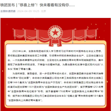 4月9日,全国铁道团委2023年度全路“双创立功”竞赛、青年岗位能手、向上向善好青年评选结果揭晓,澳门六合彩开奖现场直播