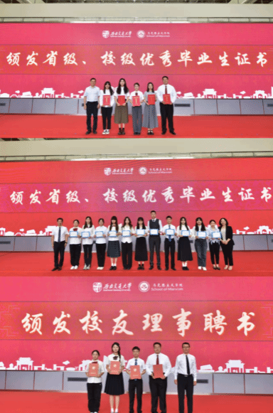 在庄重而热烈的氛围中,胡子祥副院长、李学勇副院长、谢瑜副院长为荣获省级优秀毕业生和校级优秀毕业生的同学颁发证书。杨伟宾副主任为2024届校友理事颁发了聘书。