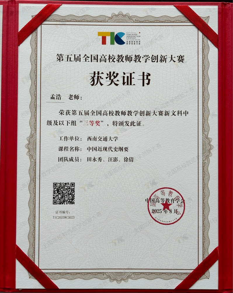 “纲要”课具有深厚的学科根基,“05方案”以来,先后荣获国家级精品课、国家级教学团队、国家级精品资源共享课、省级精品在线课程、省一流课程等标志性成果。在稍早前的2025年四川省高校思想政治理论课中青年教师“精彩一课”讲课比赛决赛中,孟浩老师又为该课程增添一项省级特等奖。在课程的前期基础上,孟浩老师通过“教研融合·现实联结·情景再现”的创新模式,将前沿科研成果融入教学内容,构建学理纵深;强化历史与现实的联结,引导学生从历史中汲取智慧;通过故事化讲述、沉浸式体验等教学环节,增强课堂的亲和力和感染力,有效提升了学生的学习兴趣和参与热情。