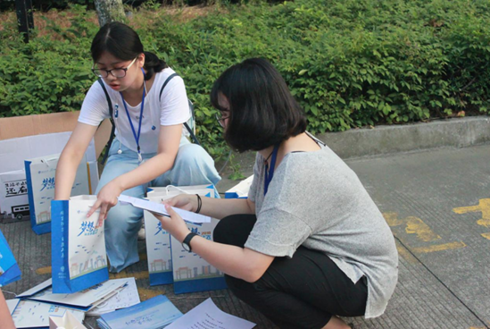 在新生到来之前,迎新志愿者们积极主动地布置着摊位和清点着物品。各个尺码的绿色文化衫、完备齐全的新生入学资料,早早在迎新点等待着新生的到来。