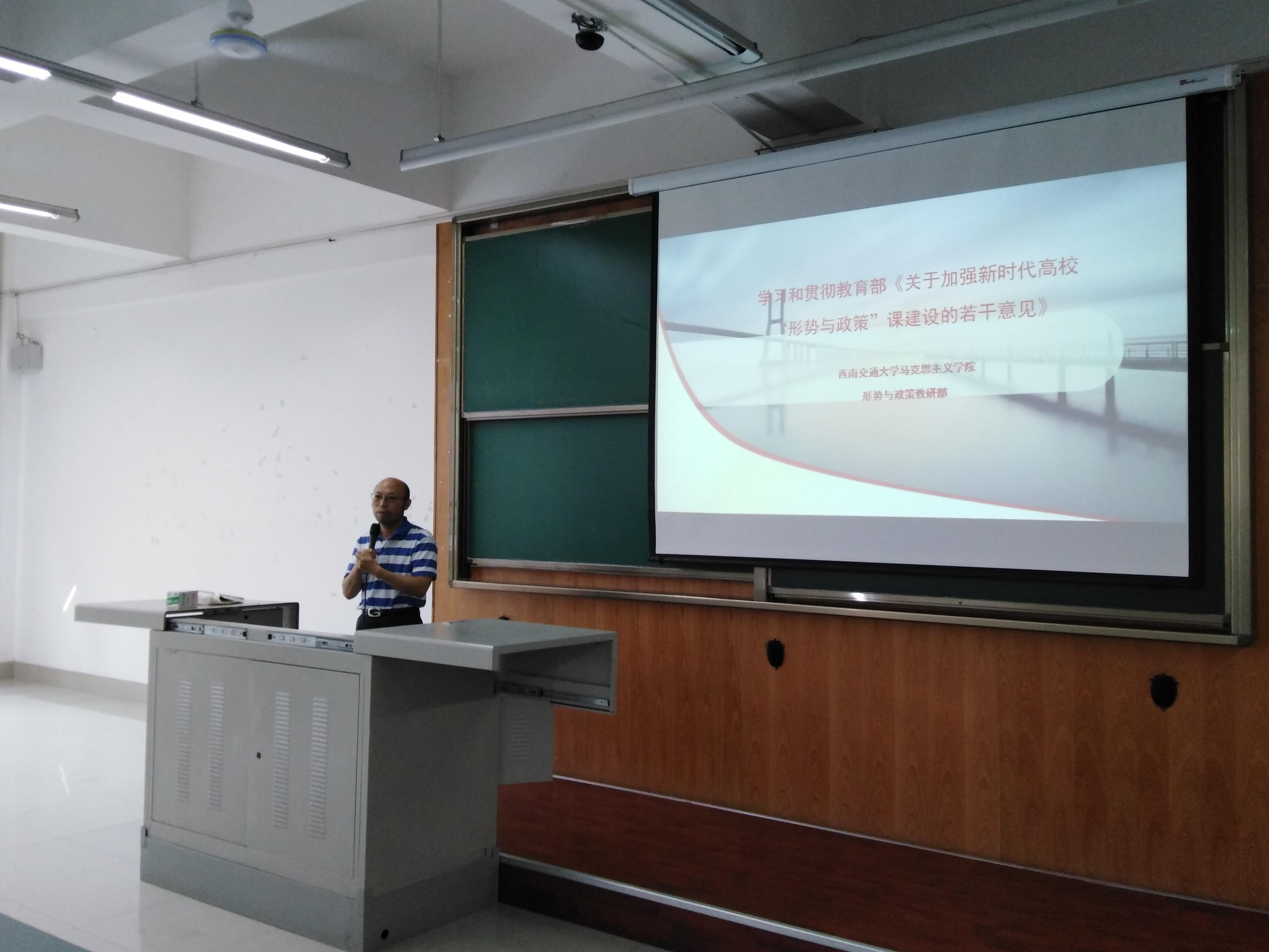 林院长向授课老师们介绍了形势与政策课的教学方案。希望广大授课老师结合国际国内形势认真备课,讲好四川发展情况,讲好西南交大校史校情。林院长回顾自己讲授的第一门思想政治理论课就是形势与政策课,很多当年的学生至今都对当时的授课内容记忆犹新。他希望广大授课教师熟悉讲授内容,完善授课方法,更好地讲好这门课。