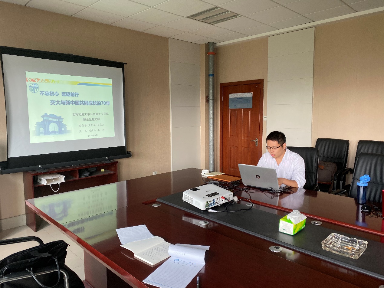 “不忘初心、牢记使命”主题教育工作安排》;其次,支部成员学习了习近平总书记在内蒙古考察时勉励大学生的重要讲话精神,并就讲话精神展开了讨论;最后支部成员结合自己的研究方向,以《新中国铁路70年的辉煌成就》《新中国成立以来党领导抗震救灾工作的历程与历史经验》《交大与新中国共同成长的70年》《新中国成立70年来扶贫(政策)的改革与演变》为题作报告,分别从新中国成立70年来我国铁路建设、震救灾工作、扶贫工作和西南交大校史这四个方面,回顾和总结70来年国家与学校的发展与变化,同时在场同学也畅谈了自己的感想,纷纷为祖国点赞、向祖国表白。