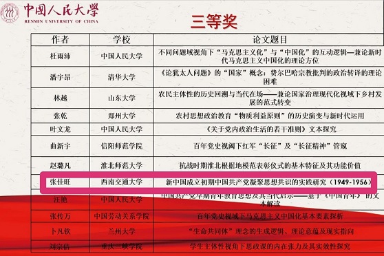 “五四杯”全国高校马克思主义理论类本科生学术论文竞赛作为目前唯一面向全国本科生的马克思理论学术竞赛,旨在挖掘培养优秀的本科生马克思主义理论研究人才,具有极高权威性与知名度,自启动以来便得到全国马克思主义本科生的广泛关注。本次竞赛共征集来自全国一百二十三所高校的四百二十余篇有一定质量、特色、心意的学术论文。经主办方聘请有关专家进行严格评审后,最终确定46篇论文获得第三届“五四杯”全国高校马克思主义理论类本科生学术论文竞赛一、二、三等奖及优秀奖。其中,我院张佳旺同学的论文《新中国成立初期中国共产党凝聚思想共识的实践研究(1949-1956)》获得了全国三等奖。交流会中,他从凝聚思想共识何以必要、何以可能与何以实现的三重逻辑做了论文报告,探寻了新中国成立初期中国共产党凝聚思想共识的运行机制,中国人民大学澳门六合彩开奖现场直播