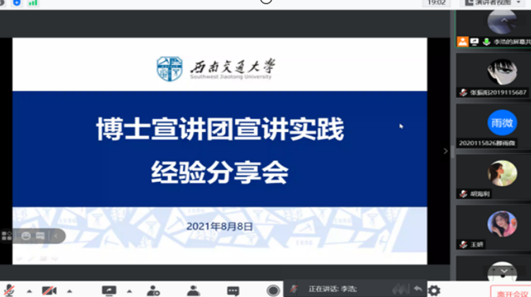 7月22日,四川省党史学习教育宣讲团、“蓉耀青年”成都大学生新思想宣讲团、西南交大博士宣讲团成员李彦虎进行了主题为《开天辟地 敢为人先——关于中共一大召开的历史问题》的宣讲。7月23日,四川省党史学习教育宣讲团、“蓉耀青年”成都大学生新思想宣讲团、西南交大博士宣讲团成员胡海利进行了主题为《学习百年党史 点亮精彩人生》的宣讲。7月27日,“全国铁路向上向善好青年”荣誉称号获得者、西南交大博士宣讲团成员罗田进行了主题为《做担当民族复兴重任的时代新人》的宣讲。