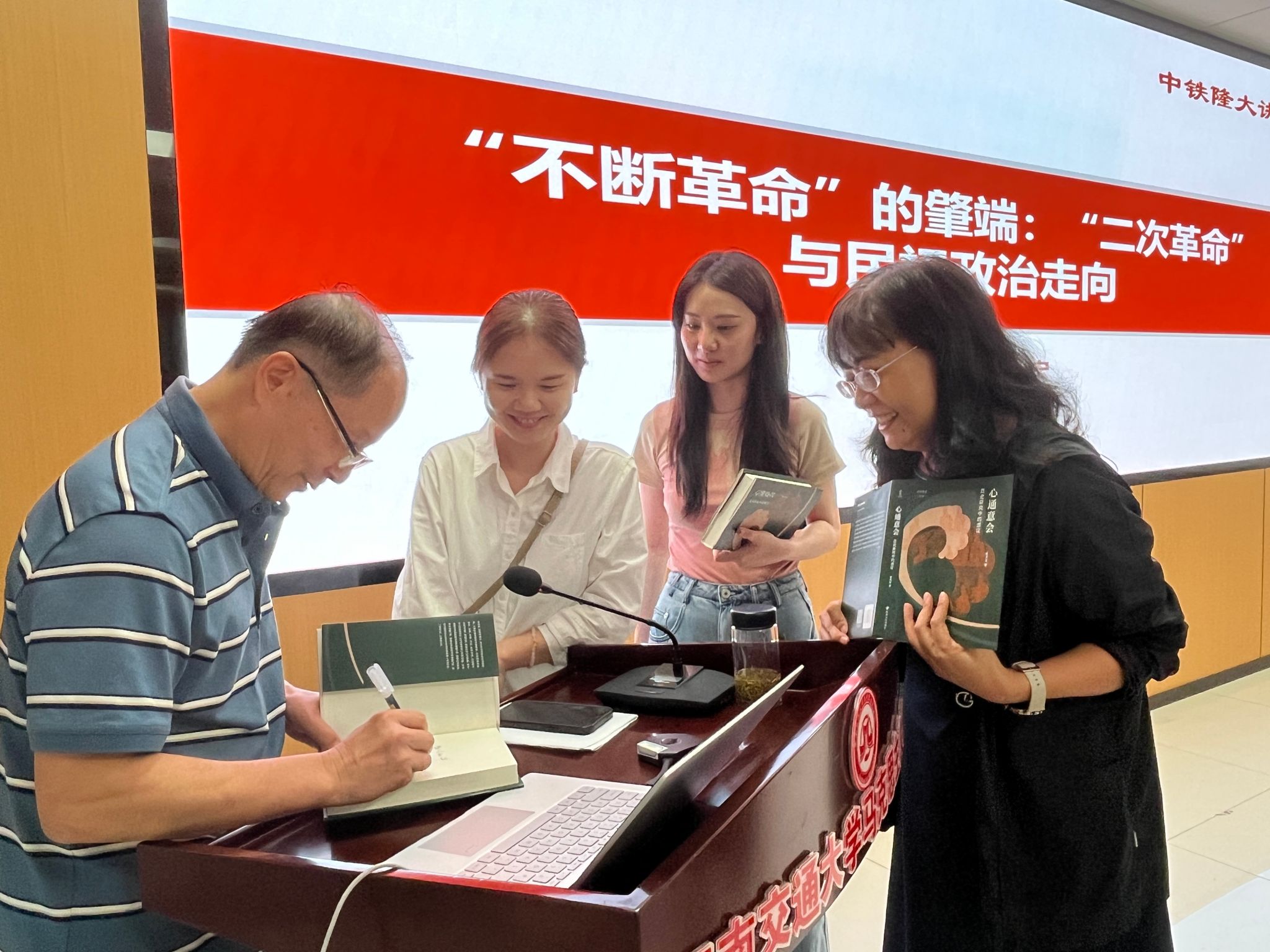 讲演过程中,杨教授还开启问答模式,鼓励学生提出疑问。田院长带着同学们向杨教授请教,提出了许多值得思考的问题。杨教授积极回答着老师和学生们提出的疑惑,独到的见解、启发性的回答征服着在场的每一位学生。与杨教授的互动鼓励了大家发现问题、提出问题、大胆质疑的勇气,提升了思辨能力。本场讲座共计两个多小时,结束后,意犹未尽的同学们还坚持与杨教授进行交流,杨教授也认真地为每位学生解疑答惑,并为手持其新作的老师和同学们签名写下鼓励与祝福。