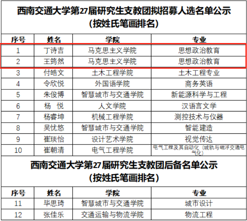 按照《关于组建中国青年志愿者第27届(2025—2026年度)研究生支教团有关工作的通知》(全国项目办发[2024]3号)的相关要求,根据《西南交通大学第27届研究生支教团招募选拔工作方案》,在自愿报名的基础上,经组织初审,相关基础知识测试、面试、民主测评等环节,拟确定西南交通大学第27届研究生支教团招募人选(含后备),我院入选同学公示如下: