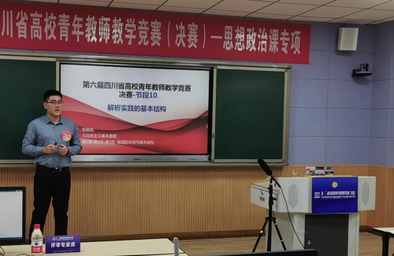 From July 5 to July 6, 2022, the final of the 6th Sichuan Province Teaching Competition for Young Universities Teachers, sponsored by Sichuan Federation of Trade Unions, Sichuan Provincial Education Working Committee, and Provincial Department of Education, and hosted by Sichuan Normal University was held in Sichuan Normal University. Ninety-three teachers from 38 universities across the province won from more than 20,000 young teachers from 126 universities. Contestants were divided into five groups to compete teaching skills in the final. After preliminary, semi-finals, and final, faculty member Li Yuanbo bulldozed his way to the second prize with the third place in the ideological and political course group, realizing a new breakthrough in the performance of our School for this competition.