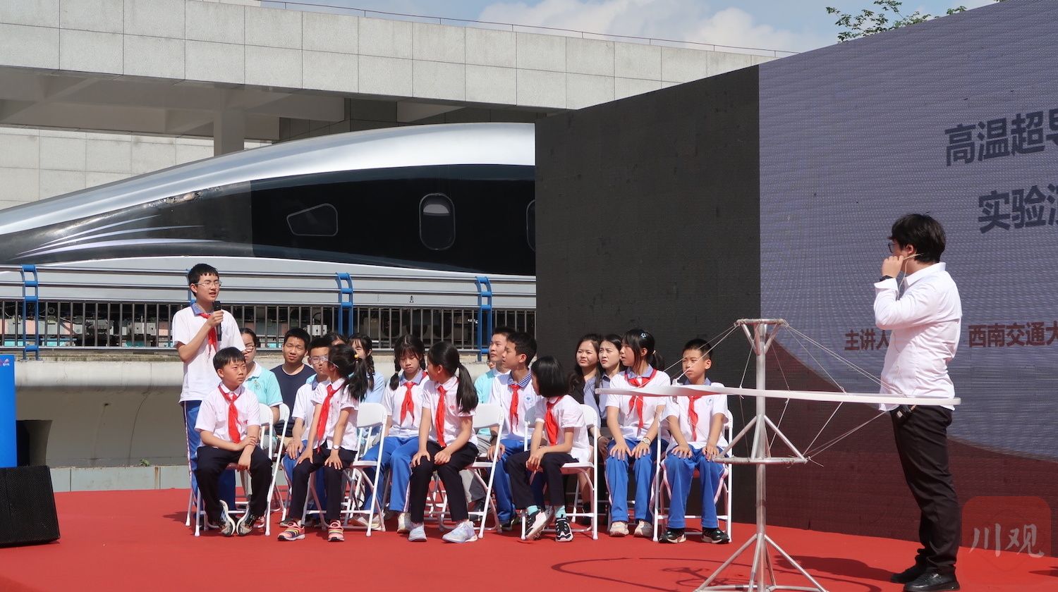 现场,来自西南交大轨道交通运载系统全国重点实验室的青年科学家王理进行了高温超导磁悬浮技术实验演示,并邀请大中小学生切身体验,深入感受科技创新的力量。