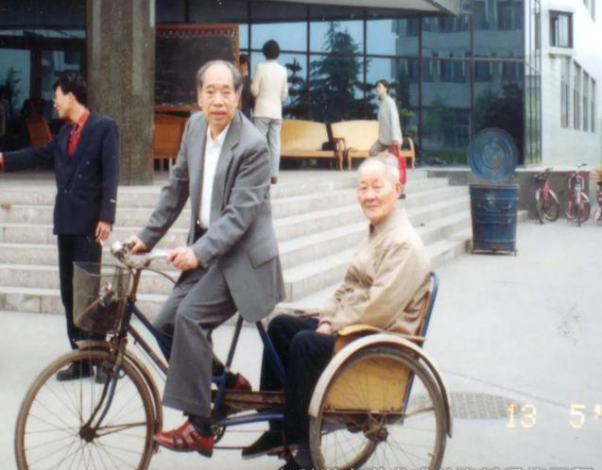 沈志云骑着三轮车和曹建猷参观牵引动力国家重点实验室