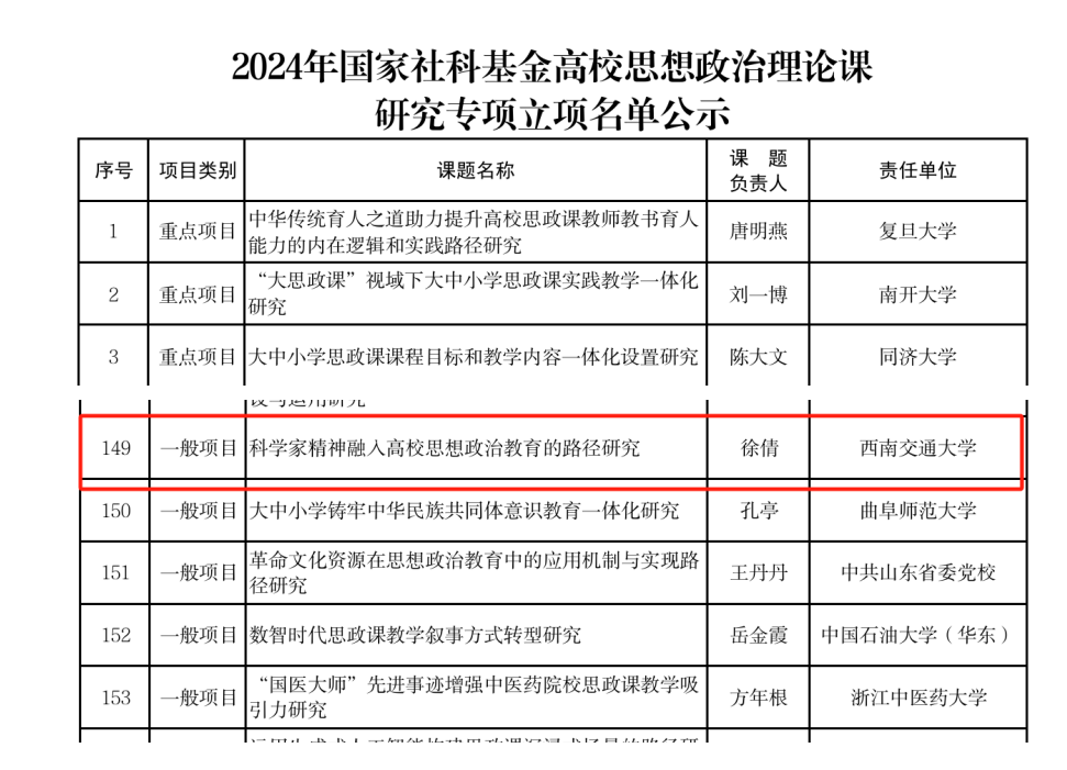 2024年12月12日,我中心研究员、澳门六合彩开奖结果现场直播网站 讲师徐倩,获2024年国家社会科学基金高校思想政治理论课研究专项一般项目立项公示。此次立项的课题名称为“科学家精神融入高校思想政治教育的路径研究”。该课题旨在深入探究科学家精神景观文化空间的构建与精神传导机制及其育人功能的效果评价和优化路径,结合文化社会学与思政教育理论,通过社会调研与理论分析,探索科学家精神多维度深度融入高校思想政治教育体系的优化路径。